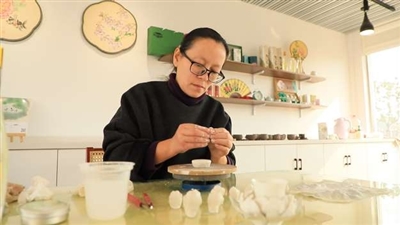 在制作中,郑莹还融入巧思与在地元素:她以可食用的牡丹籽油替代传统脱模油,使制作更环保、花瓣更易塑形;为追求叶片逼真,她拾取园中落叶拓印于陶泥之上,使细节充满生机。