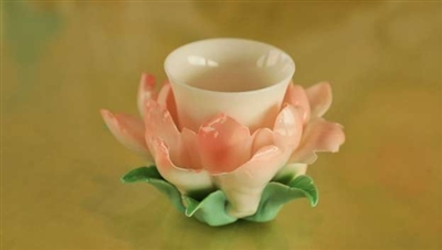 《牡丹杯》以普宁牡丹为灵感,融合闽南白瓷土、羊脂玉泥与绿色陶泥,历经原料研磨、手工捏塑、素烧、施釉、釉烧等十余道古法工序制作而成。杯托花瓣薄如蝉翼,形态灵动优美;配套的白玉杯瓷质高白温润,透光可见指影。作品既保留牡丹天然形态,又赋予现代审美意趣,堪称“品茗赏瓷两相宜”的雅器。
