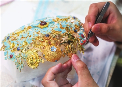 12月24日,在位于匡堰镇倡隆村的楝树下艺术村落的花丝镶嵌非遗工坊内,花丝镶嵌技艺传承人高聪在用点翠工艺制作花丝镶嵌工艺品。