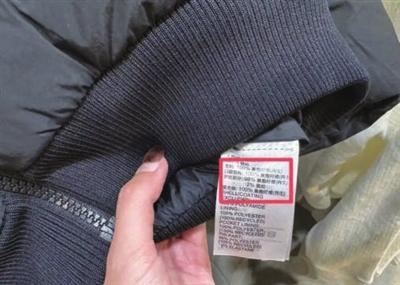 在某运动品牌店内,记者随机查看了两件棉服的水洗标。标价均为1000多元的两款棉服,里料、口袋里料、填充物均为100%聚酯纤维。