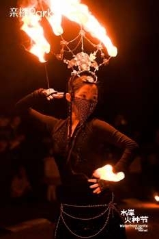 18时30分,舞者们身着华丽的服饰,随着动感的节拍起舞,手中的火焰时而舒展时而急促,在水岸夜色中勾勒出一道道绝美的弧线。