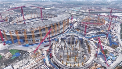 本报讯 (记者 朱云岚 通讯员 刘家彤) 昨日,新中心重大配套项目、中轴线地标性建筑余杭国际体育中心“一场两馆”屋面钢结构全面合龙。