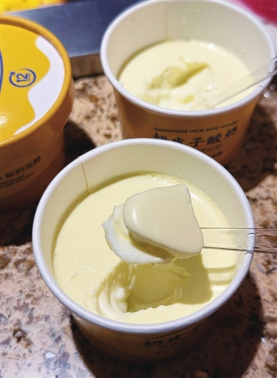 奶皮作为非物质文化遗产,承载着内蒙古草原牧民温暖的记忆。如今,它成为一种元素被加进各种饮品小吃里,除了冰糖葫芦、酸奶,还有杨枝甘露、蛋糕、月饼、咖啡等,网友戏称“万物皆可奶皮子”。