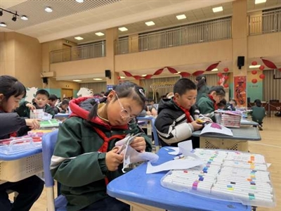 另一边的万马奔腾工作坊内,一张张空白小马图在孩子们的画笔下变得灵动起来,七彩的马身上点缀上星星、爱心、甜甜圈等可爱元素,每一笔都透着童真与巧思。202班的金凡钦小心翼翼地将裁剪好的小马画作粘贴到“校园八骏图”展板上。“红色的马身代表吉祥,我在马背上画了一个蓝色福字,祝同学们新年马上有福!”金凡钦说。
