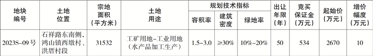 2023S-09号地块申请人竞得土地后应与鸿山镇人民政府、市直相关部门签订《监管协议》,否则取消其竞得资格。有意向报名的申请人报名时应了解确认《监管协议》有关内容。该宗地《监管协议》约定:自交地之日至竣工投产前,土地竞得人(含其关联企业)每个完整纳税年度亩均税收不低于25万元/亩。竣工投产后前8年每年亩均税收不低于30万元/亩,该项纳税要求应为本宗地投产项目产生的新增税额,土地竞得人原已在本市纳税的,其公司在竞得土地前的纳税情况不计为本宗地新增税额。