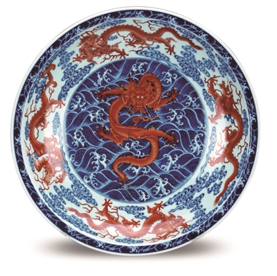 清雍正款青花红龙大盘,高8.7、口径47.4、底径27.6厘米。此盘青花为雍正时期典型色,盘心是一条正面红色五爪盘龙,在青花绘制的海水江崖中追逐一颗红色火焰珠。盘四周腹部另有四条红色釉龙,在青花如意云纹中互相追逐,神态各异,栩栩如生。盘沿处绘有青花海水江崖纹。盘外腹部与盘内腹部彩绘相同纹饰。盘底有青花楷书“大清雍正年制”六字两行双圈款。