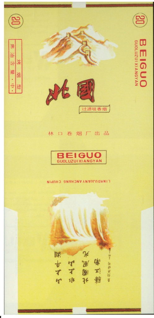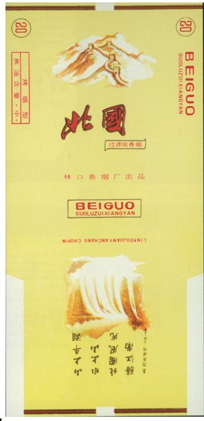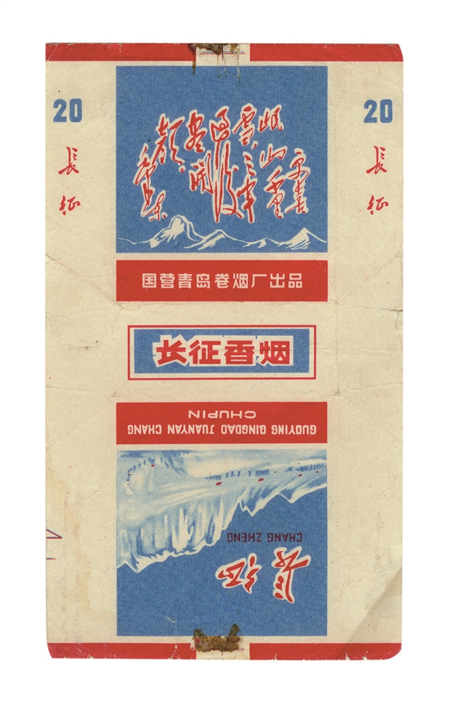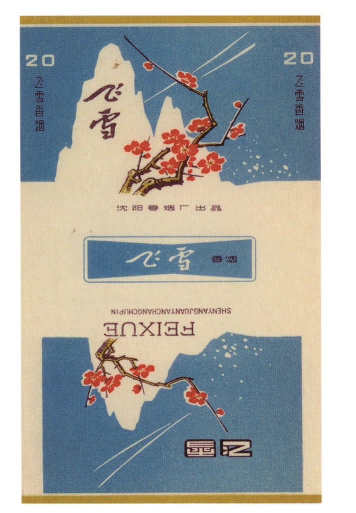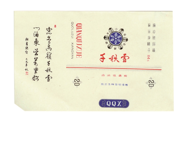 由于雪深受人们欢迎且富于诗情画意,因而我国的烟草企业,根据历代文人墨客写的诸如“六出飞花入户时,坐看青竹变琼枝”等许多令人目不暇接、心旷神怡的描绘和赞美雪花的诗词,出品有许多意境深远、诗画相映的烟标。如乌兰浩特卷烟厂根据唐代大诗人杜甫著名的《绝句》:“窗含西岭千秋雪,门泊东吴万里船”诗意,分别出品有千秋雪、万里船烟标,其中设计简洁明快、色彩调和、独具匠心的“千秋雪”烟标(图1)为白底,该标主版是在“千秋雪”标名的上方,绘有一幅内圈为蓝底、外围为白底的共由八朵雪花组成一朵大雪花的画面,副版则用遒劲有力的行草书印有这两句诗。国营青岛卷烟厂出品于同期的“长征”烟标(图2),主版图案再现的是长征中的红军大部队扛着红旗冒着大风雪,向雪山顶奋勇前进的画面,副版则在连绵不绝的雪山上方印有毛泽东所作《七律·长征》中“更喜岷山千里雪,三军过后尽开颜”的书法手迹。沈阳卷烟厂出品的“飞雪”烟标(图3),则在天蓝的底色上,描绘了在寒风凛冽并不时飘飞雪花的恶劣天气里,红梅仍然傲雪开放。品其画面,似乎有宋代文学家卢梅坡在其《雪梅》诗中所言:“梅雪争春未肯降,骚人搁笔费评章。梅须逊雪三分白,雪却输梅一段香”的意境。林口卷烟厂出品的“北国”烟标(图4),主版所展现的画面,无疑源自毛泽东在其《沁园春·雪》上阕开头所描绘“北国风光,千里冰封,万里雪飘。望长城内外,惟余莽莽”的豪迈激昂、气势雄浑之诗意。
