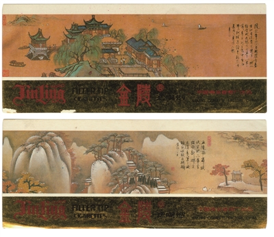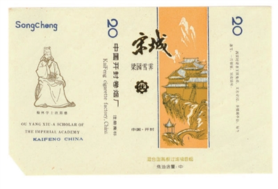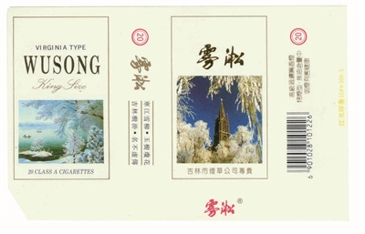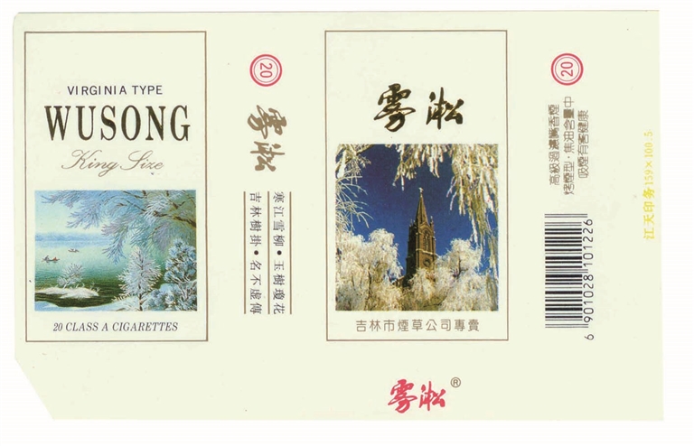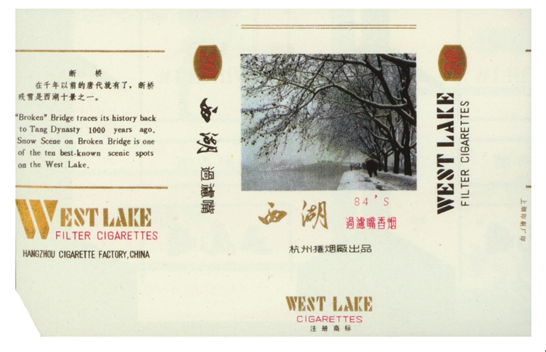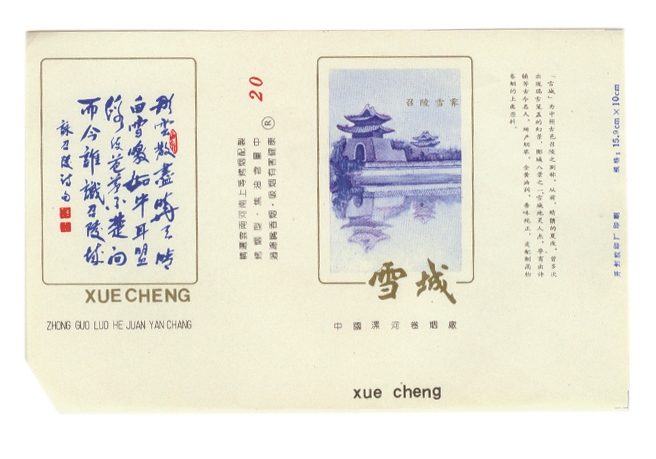 此外,尚有许多充满诗情画意的瑞雪与风景名胜相映成趣的烟标。如漯河卷烟厂出品的“雪城”烟标(图5),其主版图案则描绘了位于漯河市召陵镇银装素裹的召陵雪霁美景,同时于其右侧标位置对之作有说明:“‘雪城’为中州古邑召陵之别称。从前,晴朗的夏夜,曾多次出现瑞雪笼盖的幻境,郾城八景之一。雪城地灵人杰,孕育出许慎等古今名人,所产烟草,金黄油润,香味纯正,是配制高档卷烟的上乘原料。”烟标副版则用行草书印有明代诗人杨元祥所作《咏召陵》七绝“彤云散尽晓天晴,白雪皎如牛耳盟。假使苞茅不问楚,而今谁识召陵城”。 而河北石家庄卷烟厂出品的“热河”套标(图6)中,有一枚主版描绘的是河北承德避暑山庄“康熙三十六景”之第十三景——南山积雪的美景:只见白雪皑皑的僧帽峰上,十分醒目地显露出几株被白雪覆盖的青松。副版则用行草书录有康熙的《南山积雪》七绝诗句:“图画难成丘壑容,浓妆淡抹耐寒松。水心冰骨依然在,不改冰霜积雪冬。”其它诸如寒江雪柳、梁园雪霁、断桥残雪、石城霁雪、远眺雪山等不少因雪而成名的著名景点,也不时在烟标上有所体现。如为配合1991年吉林市首届雾凇节,四平卷烟厂与吉林市烟草公司合作出品有多种版别“雾凇”烟标(图7),其主副版图案大多数表现的是我国四大自然奇观中唯一的季节性景观——神奇、纯洁、瑰丽的雾凇美景画面,同时有的烟标还于侧标位置印有当年江泽民总书记视察吉林期间,饱览雾凇风采时写下的题词“寒江雪柳 玉树琼花 吉林树挂 名不虚传”字样。更多的雪景则多见于成套烟标,其烟标在描绘雪景的同时,还印有相关的介绍文字。如开封卷烟厂出品的“宋城”烟标(图8),就有一枚主版图案描绘了开封的梁园雪霁醉人景色,同时于侧标位置印有相关文字简介“西汉时梁孝王筑兔苑,又名梁园,多楼阁亭台,每冬落雪,一片银装,另有情趣”。杭州卷烟厂出品于同期的“西湖”套标,其中有一枚主版(图9)图案再现位于西湖白堤东端的断桥美景画面,副版则印有“断桥,在千年以前的唐代就有了,‘断桥残雪’是‘西湖十景’之一”字样。南京卷烟厂出品的四枚套“金陵”听标,其中一枚(图10)以横长的宽银幕形式,描绘石城霁雪的景观,同时于其画面右侧,配有宋代诗人苏泂《金陵杂兴二百首之一》全文“五陵歌舞换埃尘,地下黄金出尚新。碑字已漫青草死,酸风吹煞石貔貅”。四川什邡卷烟厂出品的“天下秀”套标中,有一枚(图11)烟标于副版描绘了位列峨眉十景之一的远眺雪山美景,烟标在渲染白雪覆盖、层次分明的雪山苍茫景色的同时,不忘对之予以介绍“峨眉山顶的气温很低,一到冬季,峨眉山成了一个白茫茫的洁净世界,群山丛林,如精雕玉琢,置身于此景,无不心旷神怡”。
