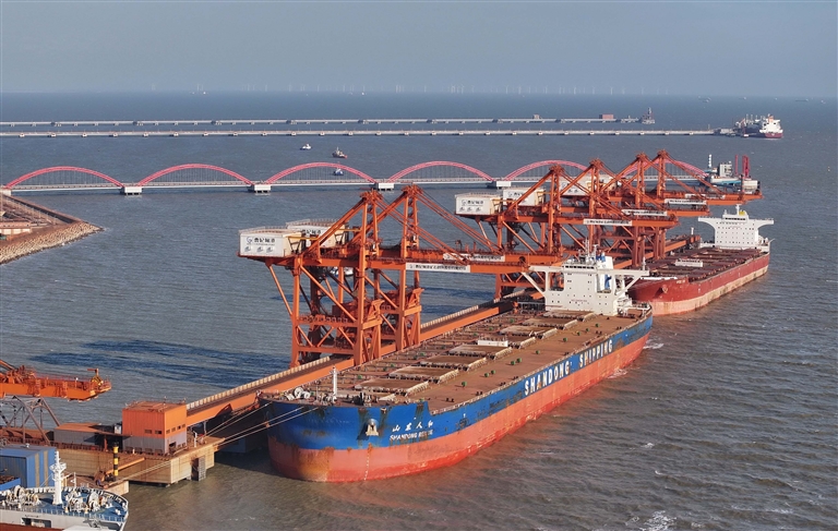 2023年12月26日,两艘轮船靠泊在唐山港曹妃甸港区矿石码头卸载(无人机照片)。 近年来,河北省唐山市持续优化港口和铁路集疏运体系、推动港口基础设施建设、加快内陆港和跨境班列发展,提升港口集疏能力,打造陆海联通内外贸物流大港。 据介绍,目前唐山港已建成泊位144个,建成内陆港55个,辐射腹地覆盖11个省(市);内外贸海上货运航线达235条,通达80多个国家和地区的200多个港口。(新华)