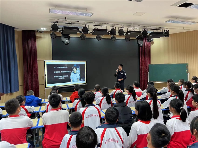 本报讯 近日,石狮市公安局鸿山派出所社区民警走进福民中心小学开展防校园欺凌法治讲座。