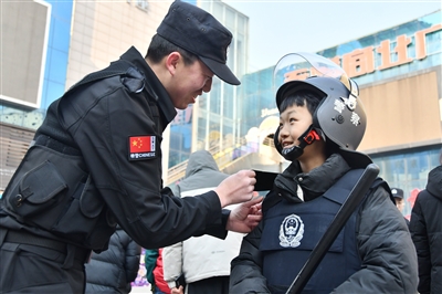 1月8日,在河北省邯郸市永年区警民互动活动上,一名小朋友在体验警用装备。近日,多地举办警营开放日、安全宣传进校园等活动,迎接第四个中国人民警察节。(新华)