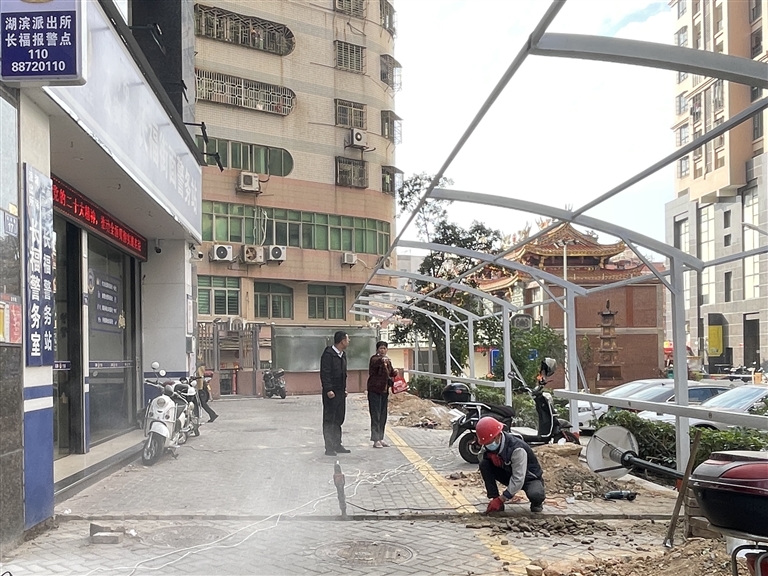 本报讯 日前,记者来到湖滨街道长福社区街面警务站看到,坐落于此处的电瓶车充电桩正在紧锣密鼓地施工中。