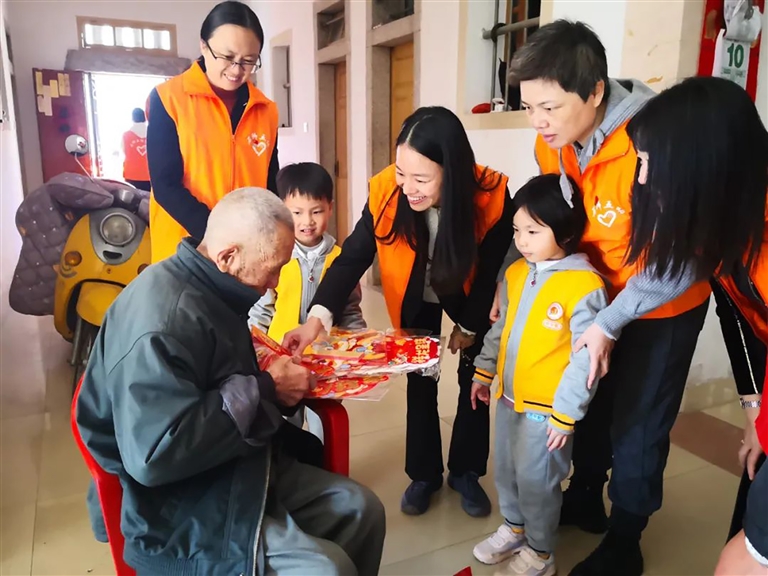在龙穴社区党支部书记高清显和党员干部的陪同下,志愿者们一起走访了社区的五保户与孤寡老人,与老人们亲切谈心、拉家常,了解他们的生活状况和健康情况,切实帮助孤寡老人解决实际困难,并送上大米、食用油等慰问品及慰问金,让他们感受到学校以及社区的关怀与温暖。小朋友们向爷爷奶奶们送上新年祝福,祝愿老人们新年快乐、健康长寿,整个活动现场暖意融融。(记者 许小雄)