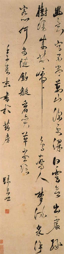 归昌世行书七律诗轴(见图),洒金笺,纵117.3、横30.4厘米,上海博物馆藏。此书为作者四十岁时的作品,书风清雅流美。释文:“幽意写不尽,万山深更深。白云无出处,绿树漫成林。啼鸟醒人梦,流泉净客心。何当随钓艇,看奕草堂阴。壬子春末书于药房。归昌世。”意多含蓄而古拙。字多为方正之长形,大小随形,不作整齐划一安排,虽有法而不循法,变化天然,天真烂漫,毫无轻佻之习,富含洗尽铅华之气,而秀丽之趣溢于意表,赏之心花怒放,悦人之目。用笔方圆兼施,互相包容,方笔方尖峭劲,圆笔灵动,二者并不矛盾,增添了变化之美。用墨枯湿浓淡交替。线条轻盈夸张,使转自然,细细品赏则愈探愈有味,有一种特殊简静之美深蕴其间。第一行的“处”字撇画、第二行的“啼”字竖画,稍显夸张,增添无尽的情趣,恰到好处,甜而不腻。节奏随着行草交替出现而变化,产生了音符跳跃美。如第三行“钓艇”是规规矩矩的行书,“看奕”用行草法则行笔速度明显加快。空间适宜,透气舒服,这与徐渭风樯阵马的风格截然不同。落款分两段,名字与时间地点分开。