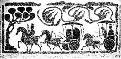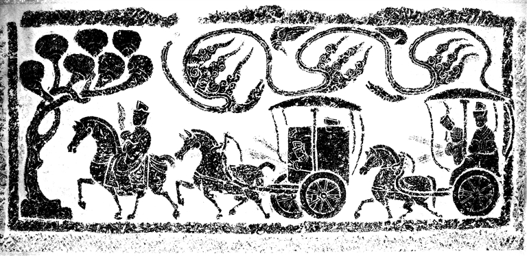 如图所示这幅《车马出行图》汉画像石拓片,刻一骑从开道,车队由一辎车一轺车组成;前有一银杏树,上饰鸟云纹和二飞鸟,表示车快如飞。图中的车马从右向左依次整齐排列,马匹肥硕,姿态非常优雅。主人高冠博带端坐于马车之上,威风凛凛,充分显示出地位的高贵。以其雄浑的艺术形式,展现了自信勇武豪迈的大汉雄风。