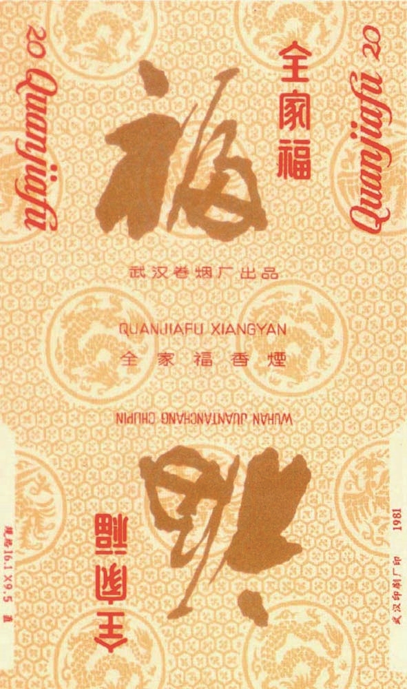 全家福历来是国人期盼的一种幸福生活最佳状态。武汉卷烟厂出品于20世纪80年代的“全家福”烟标(图10),主、副版画面,均于底版以龙为主的图案映衬下,在“全家福”标名旁边,凸显出一个表示称心如意的幸福生活状态的草书“福”字。河南商丘出品于20世纪90年代的“万家福”烟标,主副版相同的画面上,采用一幅由聚宝盆,以及由两条鲤鱼捧着,一只蝙蝠嘴衔金红色为主的“福”字斗方吉祥画,寓指国人一直追求的全福愿景。