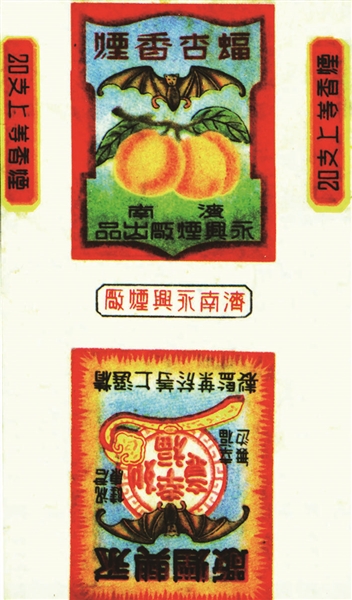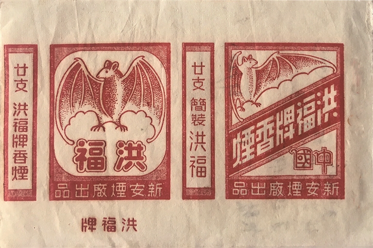 从这几枚烟标中的吉祥图案,映现了一个我国特有的社会现象:但凡有“福”的地方,总少不了蝙蝠飞舞的身影。其貌不扬、昼伏夜出的蝙蝠,得以与“福”结缘,一则源自国人谐音梗中“蝙蝠”与“遍福”同音,蝙蝠遂成为我国深受大众喜爱的福文化主角、吉祥物。再则传说蝙蝠为长寿之物,据晋代崔豹《古今注》载:“蝙蝠,一名仙鼠,一名飞鼠。五百岁则色白脑重,集则头垂,故谓之倒折,食之神仙。”到了唐代,白居易在其《洞中蝙蝠》七绝进一步点赞道:“千年鼠化白蝙蝠,黑洞深藏逃网罗。远害全身诚得计,一身幽暗又如何!”