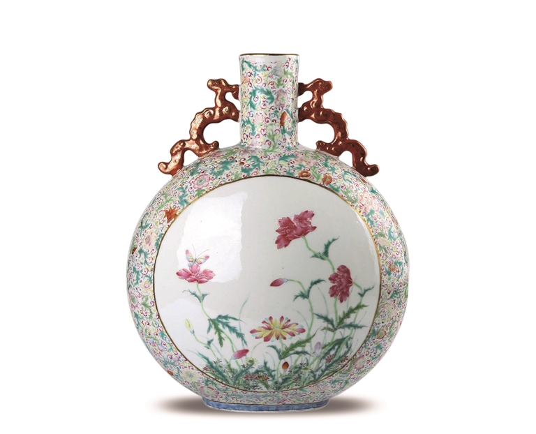 这件清雍正粉彩芙蓉蝴蝶纹抱月瓶(见图),便是芙蓉纹饰在瓷器上运用的经典之作,现藏于台北故宫博物院。此瓶高35厘米,直颈,颈两侧置对称胭脂红双龙耳,溜肩绘粉彩缠枝花卉,腹似圆月,椭圆形圈足。瓶身胎骨纤薄坚致,腹部开光,于莹白温润之釉面上绘设秋光芙蓉蝴蝶图,画中芙蓉横欹而出,吐萼含苞,风姿绰约,铺陈出新月形构图,而瓶之左上方则以极大的留白空间映衬出布局虚实结合之妙。其画笔清秀细腻,设色淡雅,芙蓉花开悠然,粉嫩怡人,绿叶阴阳反侧,尽显秋风中摇曳俯仰之姿,画意之雅犹如和风拂面,醉人心扉。含苞欲放,风情无限,构成内外辉映之效果。圈足修整细腻,抚之光润如玉,底为“大清雍正年制”六字青花篆书款,字体清秀端庄,青花恬淡。此瓶绘画、胎釉、彩料、署款,无一不精,可见雍正御瓷之非凡品格。