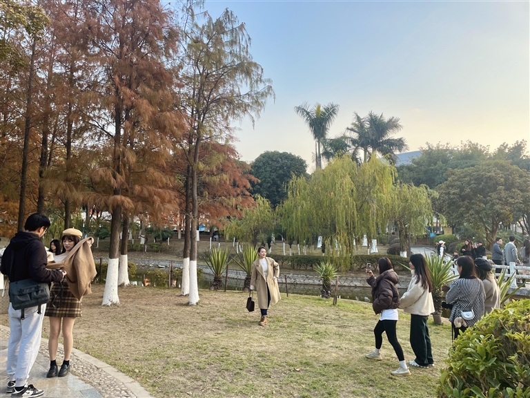 市民张女士说:“石狮的羽杉真的很美,终于不用再跑去其他地方看落羽杉了。颜色漂亮又很大一片,而且除了落羽杉外,还有很多美景,推荐大家都来看看。”游客王先生表示“挖到宝了”,对他这样的摄影爱好者来说,石狮龟湖公园简直是“拍照胜地”,在网上看到别人发的美照后,他便驱车从泉州出发,一个多小时就到了,重点还是免费的。他特地在工作日的下午来石狮,没想到还有这么多人在此拍照。经常在公园跑步的赵先生告诉笔者,最近落羽杉变红了以后,公园明显多了很多摄影爱好者,拍写真的和风景航拍的都有。