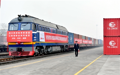 当日,首列四川西部陆海新通道江铁海联运班列正式发车。满载着25组集装箱货物的班列从四川省泸州港站驶出,经四川、贵州、广西等地,在广西钦州港下水最终运抵越南等国家。(新华)