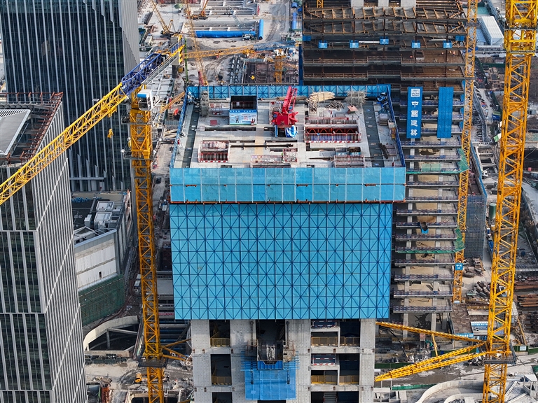 1月15日,在江苏省南京市江北新金融中心一期项目施工现场,承建方中建三局运用“空中造楼机”进行项目封顶前的最后一次顶升作业,各项施工稳步推进。据介绍,该项目建造采用智能集成“空中造楼机”,提高了高层建筑施工的机械化、智能化及绿色施工水平,让“高空作业”变为“室内施工”,施工效能提升约20%。 (新华)