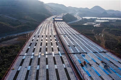 1月15日拍摄的柯桥至诸暨高速公路工程诸暨店口镇中村水库大桥施工现场(无人机照片)。 柯桥至诸暨高速公路工程是浙江绍兴市连接柯桥区和诸暨市的高速公路,也是杭州都市区环线高速公路的重要组成部分。项目起于杭绍台高速福全枢纽,终于诸暨暨阳街道浦阳新村附近,接诸暨北二环互通,全长约39.3公里,设计速度100公里/小时。(新华)