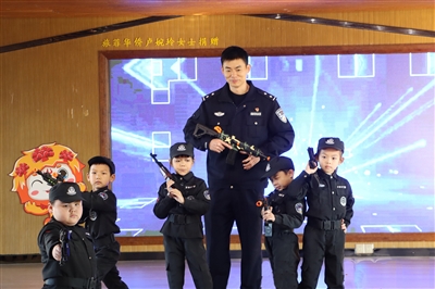 活动中,民警针对幼儿年龄特点,用通俗易懂的语言向小朋友讲解关于消防安全、交通安全、防拐骗、电信诈骗等知识和技能,通过提问和交流,帮助孩子们从小树立法律意识,学会相关法律知识和自我保护妙招。其间,民警还参与校园大手拉小手表演活动,与小朋友进行积极互动。