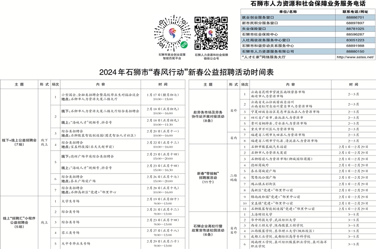 第一场线下综合类招聘会为小型国企、金融类招聘会暨高校毕业生对接洽谈会,于1月17日(腊月初七)在石狮市人力资源大厦举行;第二场综合类招聘会于2月18日(正月初九)在石狮市人力资源大厦举行;第三场综合类招聘会将于2月20日(正月十一)在石狮服装智能制造园(图灵智谷人才社区)举行;第四场综合类招聘会将于2月22日(正月十三)在宝盖科技园(乐天天超市前)举行;第五场综合类招聘会将于2月23日(正月十四)在德辉广场中庭举行;第六场综合类招聘会将于2月26日(正月十七)在泰禾广场举行;第七场综合类招聘会将于2月28日(正月十九)在石狮高新区“党建+”邻里中心举行。