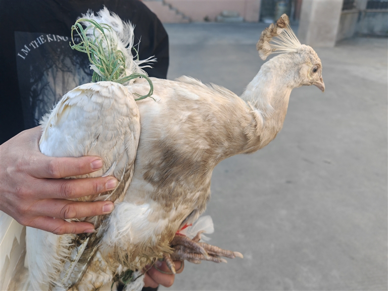 这只鸟全身羽毛洁白,但粘有污渍;头顶长着孔雀标志性的羽冠,尾羽较长,但因处于束缚状态,未能看出“大眼斑”。“今天帮父亲到田间看牛,发现这只白色的鸟伏在田里,本来以为是白鹭,人走近时它也不飞走……”王先生介绍,担心这只鸟受伤或病了,只好将其带回家里,喂食小麦等谷物,同时寻求有关部门救助,“也有人说是家养的孔雀,不知道是不是?”