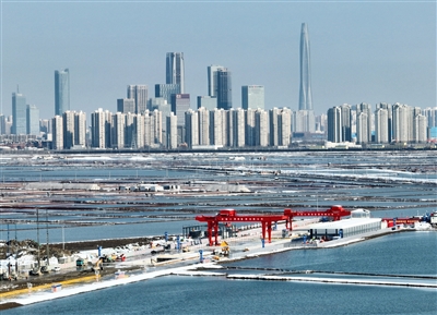 1月18日拍摄的盾构机始发现场(无人机照片)。 当日,由中铁十四局承建的津潍高铁津沽海河隧道超大直径盾构机“津城一号”顺利始发,标志着京津冀地区开挖直径最大、掘进距离最长的高铁盾构隧道正式开始掘进。津潍高铁起自天津枢纽滨海站,终至济青高铁潍坊北站,正线长度348.9公里,设计时速350公里。 (新华)
