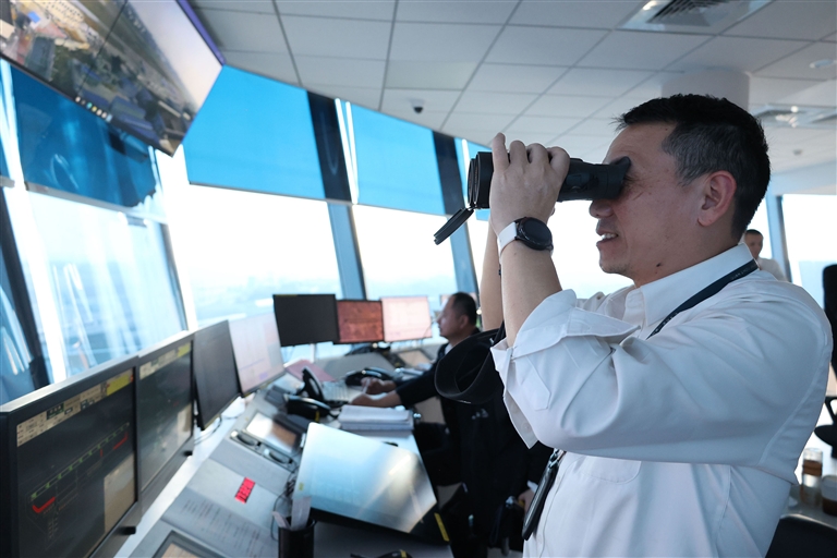 泉州晋江国际机场新塔台于2023年下半年投入使用,高34米,管制员许徐敏的工作场所就位于这里。14时30分,他准点走进塔台,参加班前会。这位2000年毕业于中国民航大学,入职已经25年的老空管,对交接工作始终保持一丝不苟的态度,从环境交接、动态交接……最后再戴上耳麦,进行席位交接。“刚入职时,老塔台的管制室面积仅24平方米,经过机场新一轮的改扩建,新塔台的管制室面积增加到120平方米,用上了全国地方机场的顶级设备……”许徐敏发自内心地感慨通航二十几年来的变化。