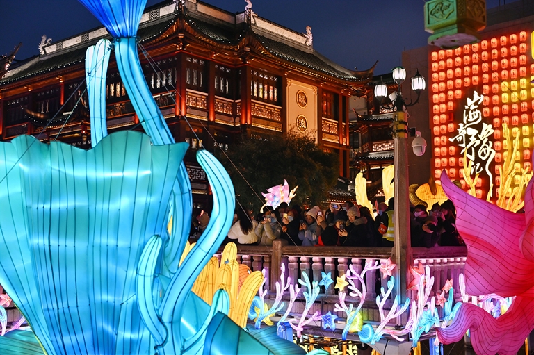 1月21日,游客在豫园九曲桥上赏灯。当日,2024上海豫园民俗艺术灯会正式亮灯。今年豫园灯会续写“山海奇豫记”,以“海经篇”为主题,生肖龙灯、海底世界、鱼群起舞、奇幻仙境等场景让游客在灯火绚烂的国风幻境中喜迎龙年新春。(新华)