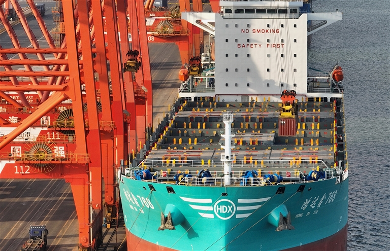 1月21日,一艘轮船靠泊在唐山港京唐港区集装箱码头装货(无人机照片)。记者从河北省人民政府新闻办公室获悉,该省2023年外贸进出口总值5818.4亿元人民币,同比增长7.4%,其中,出口3505.5亿元,同比增长9.3%;进口2312.9亿元,同比增长4.6%。(新华)