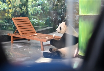 1月21日,大熊猫“喜乐”在吃竹笋。近日,天津市动物园熊猫馆经过3个月的提升改造后重新亮相,两只雌性大熊猫“格格”和“喜乐”也结束了闭馆假期,在新年里搬进了新居跟游客见面,吸引了不少游客参观。据了解,天津市动物园熊猫馆始建于1975年,使用年限较长。本次熊猫馆提升改造包含馆舍改扩建和功能提升两部分,特别是针对大熊猫喜欢攀爬的习性,增加了爬架、原木等设施。(新华)