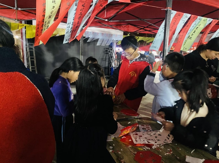 工作人员在活动现场组织了手写祈愿福卡、福灯及巧制龙灯等互动环节。在社工和志愿者的引导下,群众有序进行制作材料的签领,并在祈福卡上写出新一年的祝福、期许和心愿,亲手将其贴到祈福墙上,期待来年美好愿景。另一边,参与活动的青少年们在社工、志愿者及家长的协助下,在红色灯笼上用毛笔认真地写上“福、平安、喜乐、健康”等寓意美好的词语,同时分工进行拆卸零件、搭建框架,在众人的互相配合下,一盏盏喜气洋洋的龙年灯笼呈现在大家眼前,现场氛围喜乐融融。