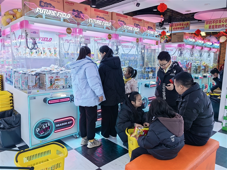 1月24日,我市小学生迎来寒假第一天,许多商场里的儿童乐园成为孩子们的集中打卡地。当天下午4时,记者在宝岛路附近一家大型商超里看到,商家精心布设的数十台的抓娃娃机、抓零食机等游乐设施前,聚集了很多小学生的身影。在家长的陪同帮助下,有的小学生不一会就抓到了十多袋零食。看着满满一筐的零食,孩子们纷纷选择与家长一起品尝,分享寒假带来的欢乐。(记者 王国良 郭雅霞)