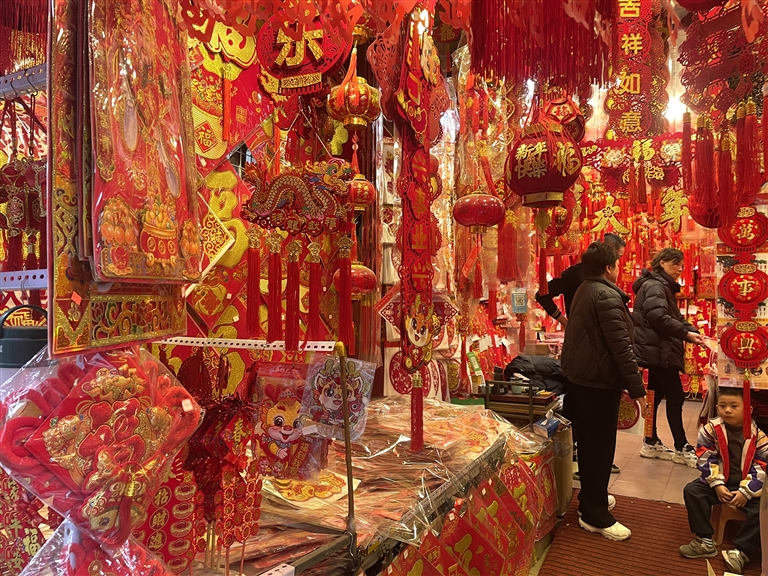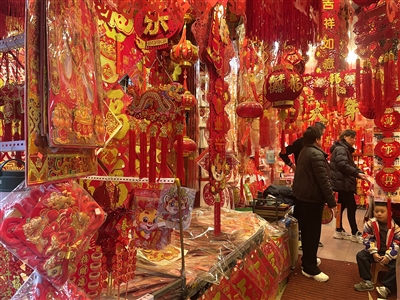 “妈妈我想要那个有龙图案的窗花!”在新华路一家店铺内,笔者看到一位年轻妈妈带着儿子正在选购年货。这位年轻妈妈说:“我每年都会带儿子来选购生肖图案的窗花、门贴。现在家里角角落落都是萌萌的小龙,过年气氛提前拉满。”