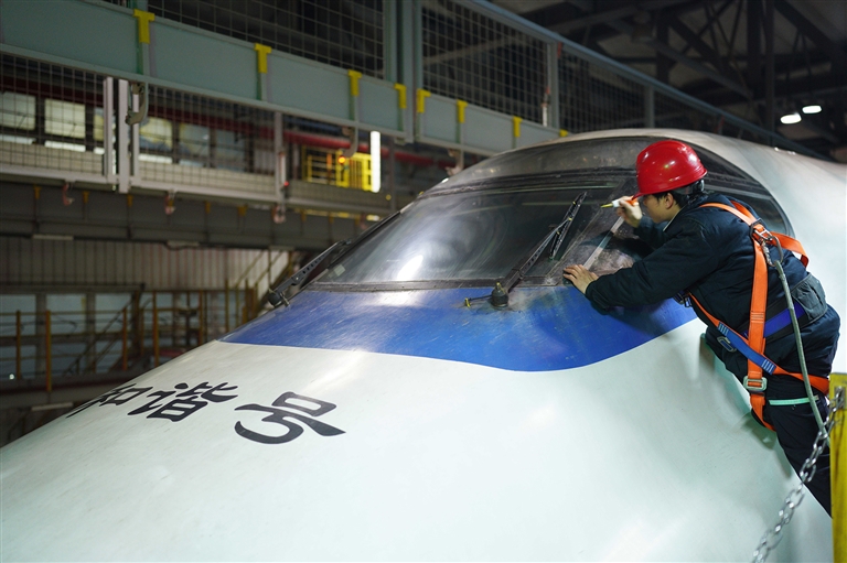 1月23日晚,在南宁车辆段桂林动车所,工作人员在检修动车。春运临近,中国铁路南宁局集团有限公司南宁车辆段桂林动车所组织工作人员对动车进行“体检”,保障旅客出行安全。(新华)