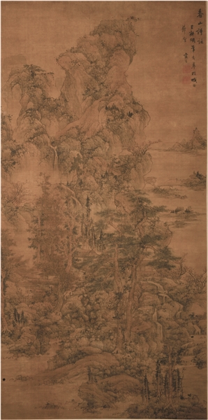 镇江博物馆收藏严忠婉女士捐赠的蓝孟《春山诗话图》轴(见图)一件,绢本设色,画心纵184、横90.5厘米。作品仿黄鹤山樵笔意,用笔疏密错落有致,构图稳重,很有气势,是蓝孟的精心之作。画款题:“春山诗画 王叔明笔意摹于城曲节堂 蓝孟”。钤“西湖蓝孟”白文方印,“次公之”朱文方印。
