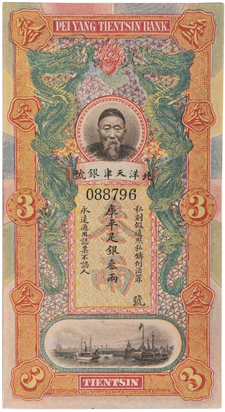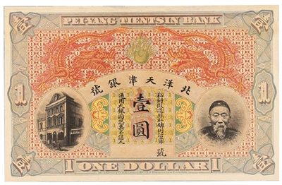 1902年8月,直隶总督袁世凯呈请户部立案注册,创立了官办的“北洋天津银号”,俗称“天津官银号”。天津官银号行址位于天津北马路东端南侧三义庙处(靠近东北角),成立后曾发行过银两票、银元票和钱票。银元票由北洋官报局印制,银元票曾以其行屋和李鸿章像、“双龙戏珠”图饰一起,作为银元票正面的图案。