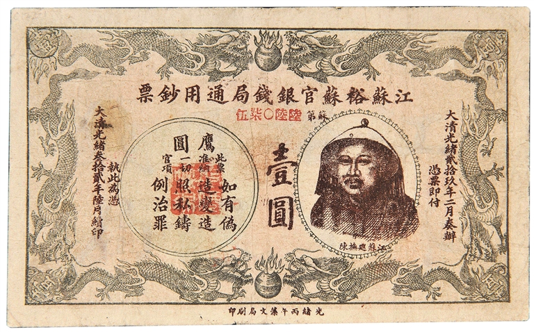 同年,江苏裕苏官银钱局发行直型制钱票五百文、一千文两种,横型通用钞票一元、五元、十元三种。横型钞上印有江苏巡抚陈夔龙头像,有“龙圆”“鹰圆”两种,又有“镇”“沪”两地之分。辛亥革命时,该局现款被军政机关提用一空,在进行清理后关闭,存世之陈夔龙像纸钞甚为稀少。这是“大清光绪叁拾贰年(1906)江苏裕苏官银钱局通用钞票鹰圆壹圆”(图3)。其正面四周边饰“双龙戏珠”图案,主图右侧印江苏巡抚陈夔龙像。背面主图为“双龙戏珠”,四周边饰花卉,钤“总局之印”“沪局之印”。