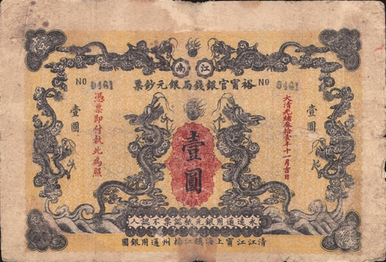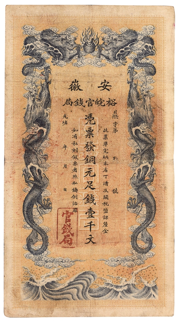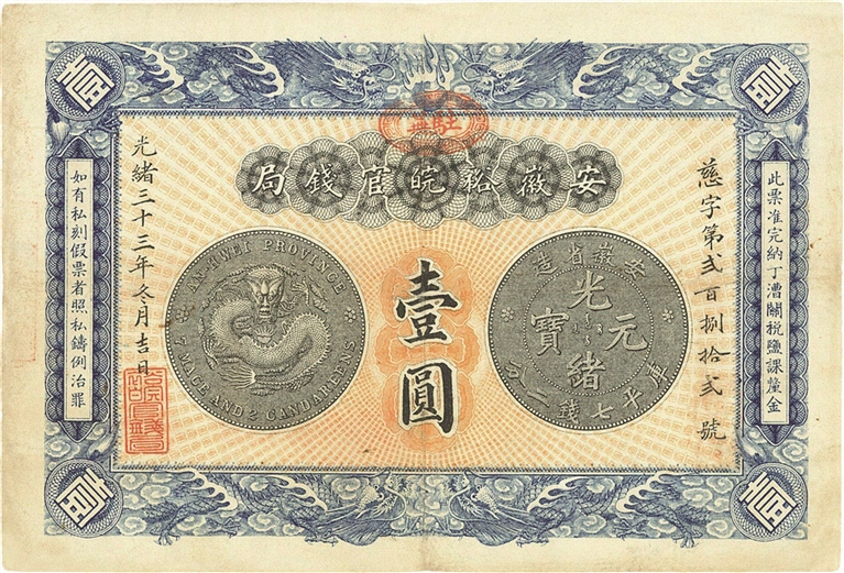 安徽裕皖官钱局票也有“龙钞”。清光绪三十二年(1906)初,安徽巡抚诚勋会同两江总督周馥上《安徽开办官钱局以维财政折》开裕皖官钱局。同年二月二十四日,清政府复文:“经部议准,钦奉准许开业”。官钱局初议由省政府招商入股,官督商办,后实为官办,由牙厘局和筹议公所各拨银5万两,合为10万两基金,于同年十月正式开业。