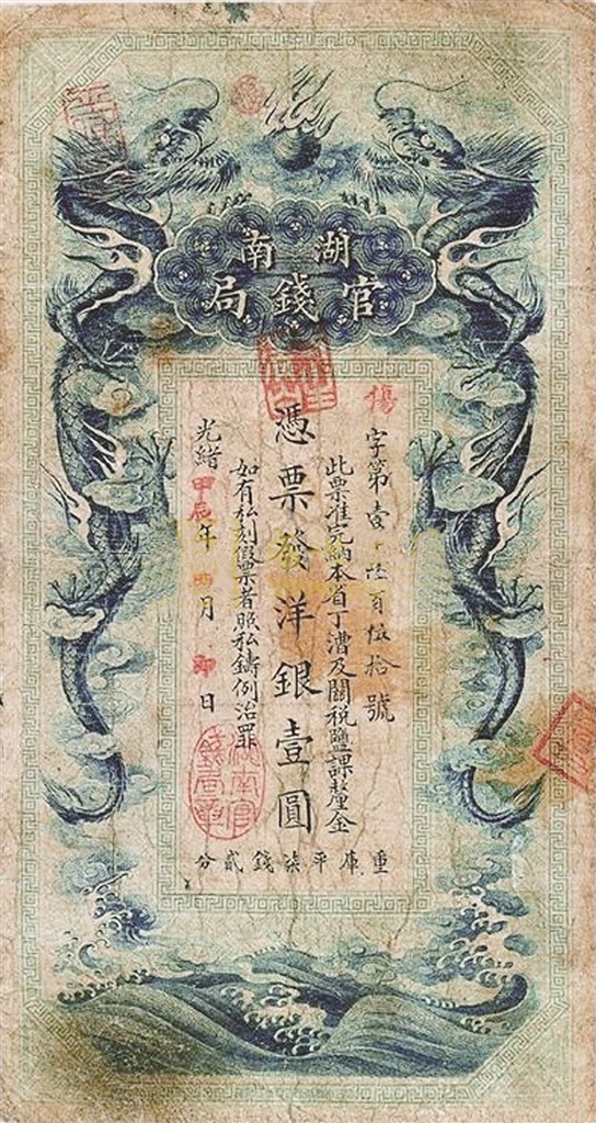 湖南官钱局成立于光绪二十九年(1903)元月,地址为长沙藩正街,其前身为阜南钱号官局。因该局发行的纸币有一定的准备金可以兑现,且印刷精美别致,而当时湖南各地店号的各种纸币充斥市场,且店号倒闭的情况时有发生,故官钱局发行的纸币信用较好,流通顺畅,成为湖南省的主要纸币发行机关,并有“台票”(藩台衙门发行的票币)之称。共发行银两票227600两、银元票375700元、铜元票880余万串及制钱票若干。