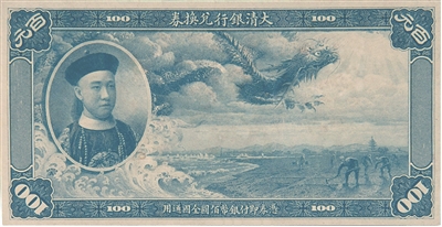 宣统二年(1910),清政府为了统一全国币制,决定印制“大清银行兑换券”(图8)。该券正面左侧为摄政王载沣半身雕像,人物肖像传神逼真。右上方为巨龙腾空图,下方为长城,印有“凭券即付银币拾元全国通用”字样以及红色编号,背面印有大清银行英文行名并盖“大清银行监督”和“检校印记”两枚印章。此券俗称大清龙钞,于宣统三年(1911)设计试色样票,但未发行即因王朝覆灭而胎死腹中,是我国货币史上首次采用雕刻钢凹版技术印制的钞票。