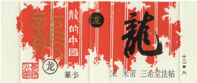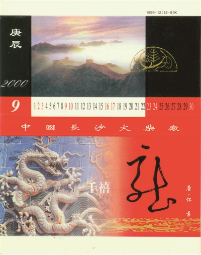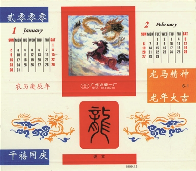 20世纪最后一个龙年期间,作为中华民族的图腾,神龙再次现身火花。如中国长沙火柴厂出品于1999年的“2000年庚辰年”火花(图9),主版于月历上方,分别印有雄伟的长城以及12块龙图瓦当,副版则分别是12条千禧腾龙,以及来自唐怀素、元赵孟頫等著名书法家笔下的“龙”字书法手迹。广州火柴一厂出品于1999年的“千禧同庆贰零零零”火花(图10),主版于龙飞凤舞、二龙戏珠、双龙出海、龙腾虎跃六幅气势撼人的国画两边,分别印有2000年月历各一个月,副版为两条腾龙相向嬉戏着一个源自说文、隶辨以及元代杨维桢等著名书法家书写的“龙”字。
