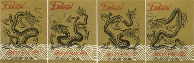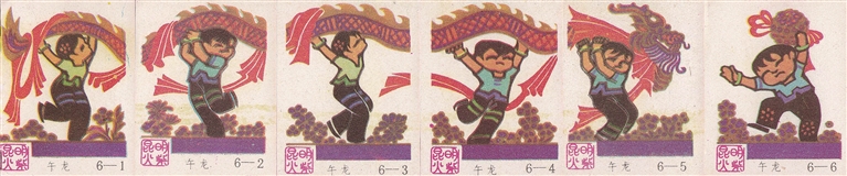 说到龙,就不能不说民俗文化活动“舞龙”。起源于我国传统舞蹈,以及对古人对龙图腾崇拜的舞龙俗称“舞龙灯”,每逢喜庆节日,人们都会舞龙,从春节开始舞龙,然后二月“龙抬头”、端午节时也舞龙。舞龙时,龙跟着绣球做各种动作,穿插,不断地展示扭、挥、仰、跪、跳、摇等多种姿势。之后以舞龙的方式来祈求平安和丰收就成为一种国民喜闻乐见的民俗文化活动。现在遍及世界各地华人集中的地区,成为中华文化的一个标志。舞龙灯的“龙”,通常都安置在当地的龙王庙中,舞龙之日,将龙身从庙中请出来,接上龙头龙尾,举行点睛仪式。龙身用竹扎成圆龙状,节节相连,外面覆罩画有龙鳞的巨幅红布,每隔五六尺有一人掌竿,首尾相距约莫有十数来丈长。龙前由一人持竿领前,竿顶竖一巨球,作为引导。舞时在锣鼓的乐曲伴奏声中,巨龙追捕着红色的宝珠腾飞跳跃,一阵子龙头高耸似冲云端,一会儿又腾空飞舞,好似蛟龙狂舞,忽而低下,像入海破浪,这样高低错落、蜿蜒盘旋的精湛表演,使观者陶醉。舞龙人和耍龙人一般都是头扎彩布,身着绸缎彩衣服饰,脚穿薄底武生快靴。我国最早的“舞龙”火花,莫过于广东佛山巧明厂出品于19世纪末期的“太和舞龙牌”火花(图11),是三个孩童高举龙灯,在前面孩童高举的彩珠引导下,欢快起舞。该图案还曾被广州上芳村太和厂、广东澳门昌明厂、彩虹桥文明厂、三水西南厂,以及贵阳协昌兴记厂等众多火柴厂运用采用,只不过在文字上略有不同而已。云南昆明火柴厂出品于1988年的六枚套“舞(火花上误为‘午’)龙”火花(图12),六枚火花拼接在一起则呈现出一幅完美的儿童舞龙图案。北京市火柴厂出品的六枚套“1988戊辰龙年”火花,副版上六幅装饰性画面拼起来,也是一幅喜庆的舞龙图。
