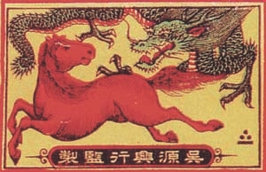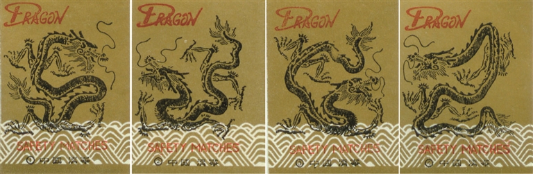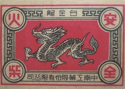 龙何时现身火花,不得而知。不过早在20世纪三四十年代,龙就在火花这个巴掌大的平台,不时显露出神龙家族的神秘色彩。如贵州惠川火柴厂出品的“龙”火花(图1),腾飞着一条三爪游龙。中南工业股份有限公司出品的“白金龙”火花(图2),是一条四爪游龙。广东省城花地出品的龙凤火花(图3),采用龙凤舞动回环的艳丽色彩,表达国人一贯追求龙凤合鸣、龙凤呈祥的美好愿景。吴源兴行监制的“龙马”火花(图4),则以红马与彩龙追逐嬉戏的画面,暗喻中华儿女具有旺盛的龙马精神。