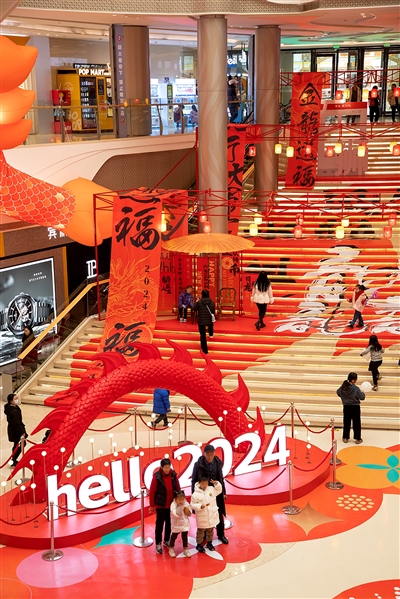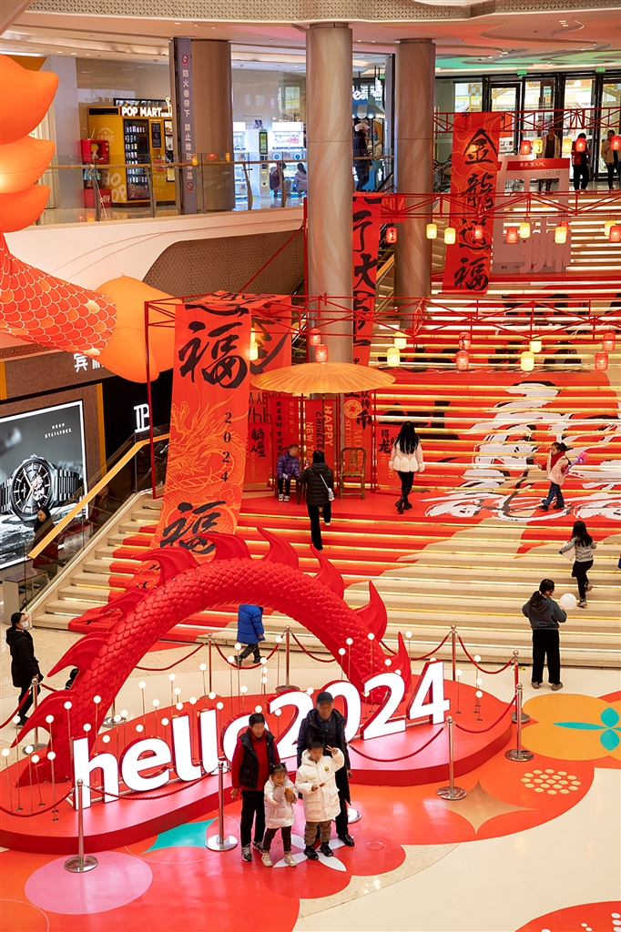 在我市世茂摩天城商场里,“龙元素”满满。走进该商场的中庭位置,除了有火红的灯笼、喜气的红包、吉祥的对联、精美的窗花,更有一条长达20多米的巨龙自商场负一楼盘踞至三楼……营造出了喜气洋洋的节日氛围。“还设置了打卡点,很棒。孩子们都放假了,带家人来逛逛,购置年货。”在附近上班的不少市民群众纷纷来此消费,同时对城市商场装饰品设计给予赞赏。“在城市许多地方都发现了,为突出龙年特色,从政府部门到商家都下足了功夫,以‘龙’为意象,展开了各种丰富的想象,将创意灵感融入年味。”市民群众纷纷给予赞许。