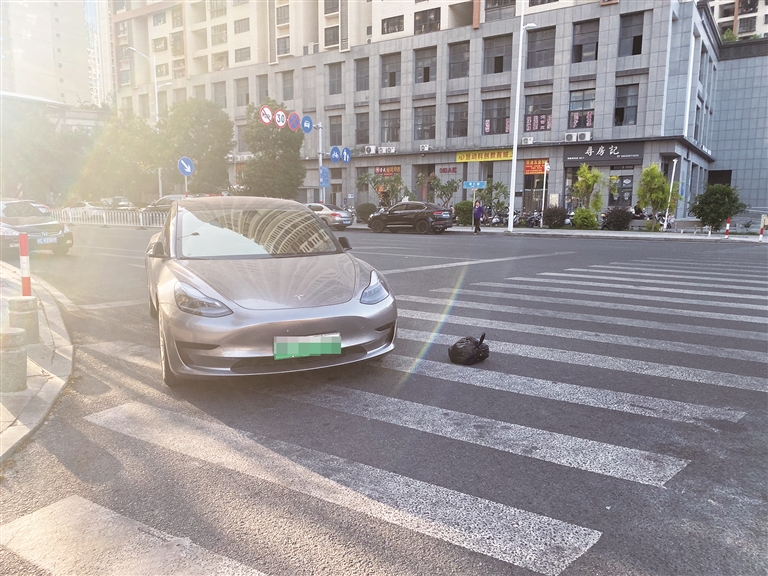 近日,笔者在聚仁路看到,一辆小轿车停放在斑马线上,旁边还有一袋垃圾。斑马线是供行人横穿马路的专用通道,在斑马线上停车影响行人通行,有失文明。(施秋凉)