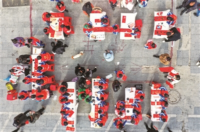 “花香满院春风至 喜气盈门幸福来”“福来似海多得意 财发如春正逢时”“天增岁月人增寿 春满乾坤福满门”……当天下午2时许,一群穿着志愿者马甲的学生正在挥毫泼墨,不一会儿,一副副春联挂在“党建+”邻里中心内外的绳子上,一股浓浓的年味扑面而来。当天,在15名老师和10名热心家长的陪伴下,第七实验小学42名喜欢书法的学生志愿者来到前园村,给村民写春联、送祝福。短短的一个小时,同学们共送出了200副春联。